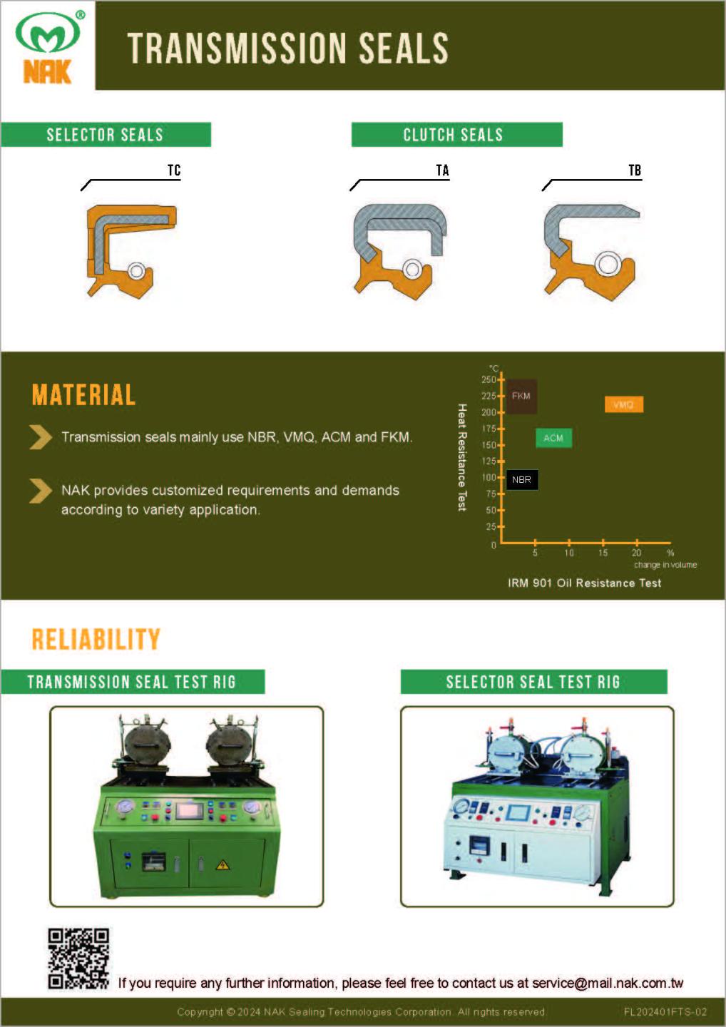 NAK is an ISO 9001/14001/45001/50001/14064-1, IATF 16949 registered manufacturer of Oil Seals and Technical Sealing Products used for a wide range of applications. With over 50 years of experience in manufacturing and technology through continual improvements on quality, NAK has secured its position on the global OE market and also became one of the top leading manufacturers of sealing products with collaboration and distribution networks spread throughout the world. NAK's seals are being used in a wide range of industrial sectors including Automotive, Industrial, Hydraulic & Pneumatic, Construction and Mining Equipment.